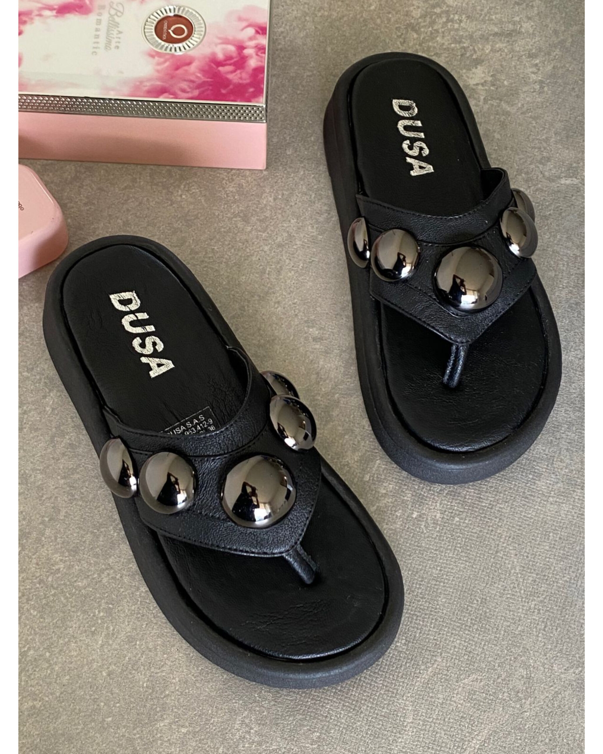 Sandalia de suela plana con altura de 3,5 cm, diseñada para brindar comodidad todo el día. Sus detalles en taches le dan un toque moderno y sofisticado, perfecta para elevar cualquier look casual.