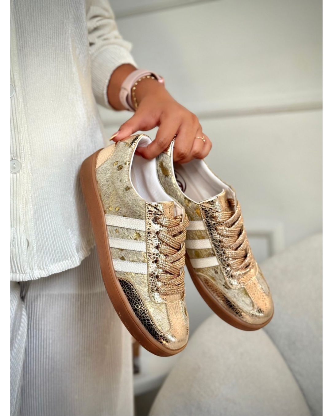 Brilla en cada paso con estos tenis en cuero genuino dorado, diseñados para mujeres que quieren destacar con estilo sin sacrificar comodidad.