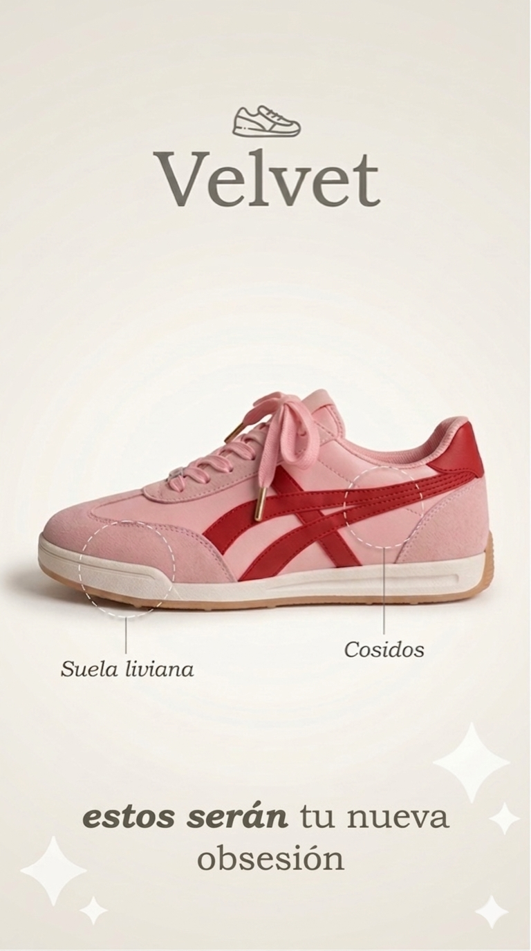Los Tenis Velvet Rosado con Rojo aportan un look femenino y moderno con un toque audaz que no pasa desapercibido. Su combinación de colores crea contraste y personalidad, perfecta para destacar cualquier outfit casual.